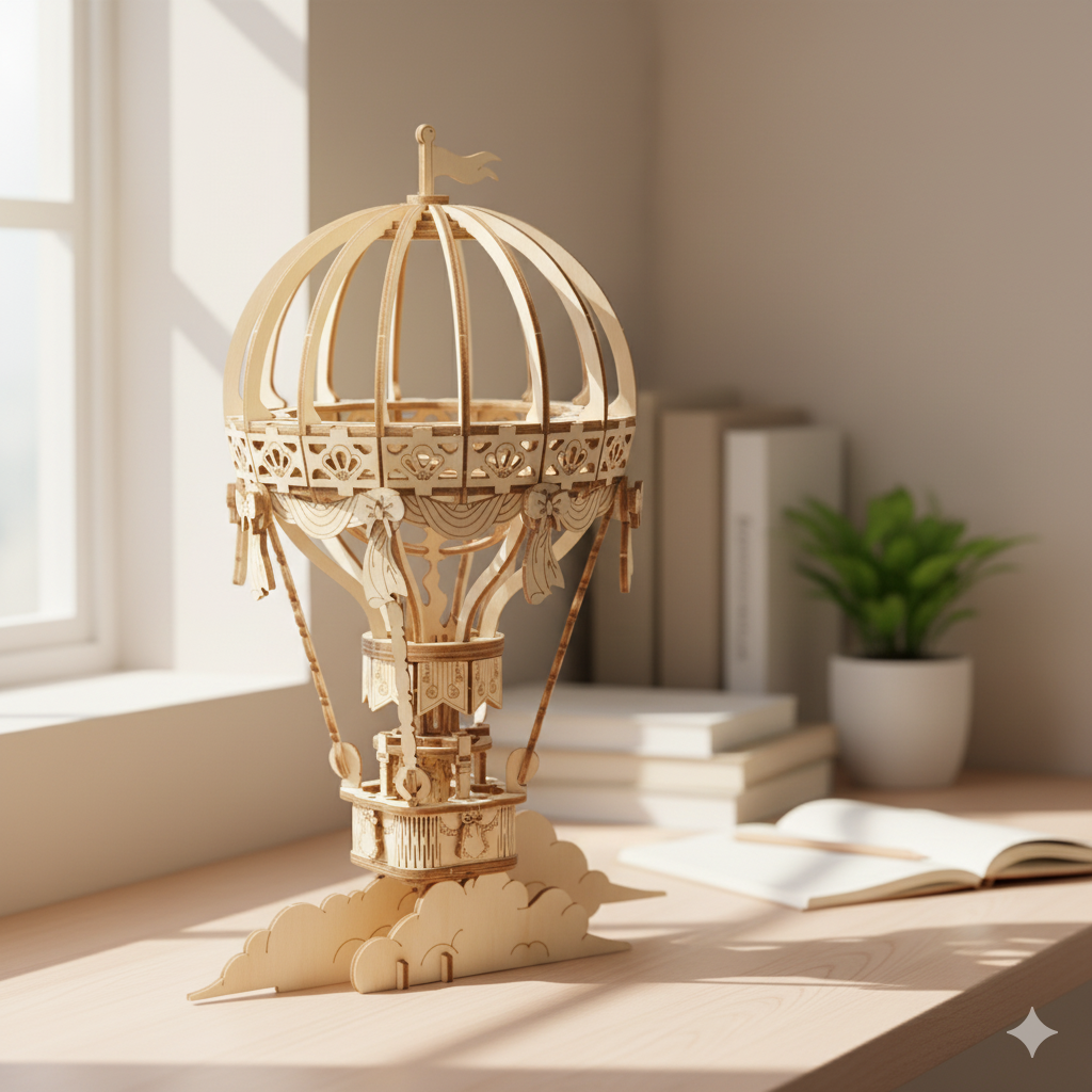 Luftballongen är en skalenlig modell inspirerad av filmerna som replikerar en verklig varmluftsballong. Den är gjord av högkvalitativt trä, med vacker dekoration och detaljerade moln i den nedre delen. Den välvda ramen fungerar som en ballong och korgen rymmer passagerarna. Modellen kan färdigställas på cirka 1,5 timme utan användning av lim, vilket gör det till ett roligt och enkelt projekt för alla från 14 år och uppåt. Den sammansatta storleken är 155x104x208 mm, vilket gör den till en perfekt heminredning för ditt skrivbord, hylla eller fönster.